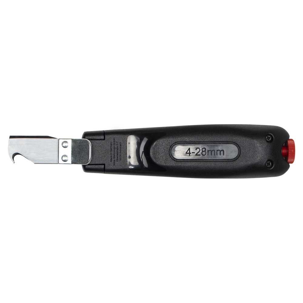 - При помощи регулировочного винта, производится плавное изменение глубины резания, что позволяет удобно снимать оболочку с любых круглых проводов ∅ 4-28 мм.